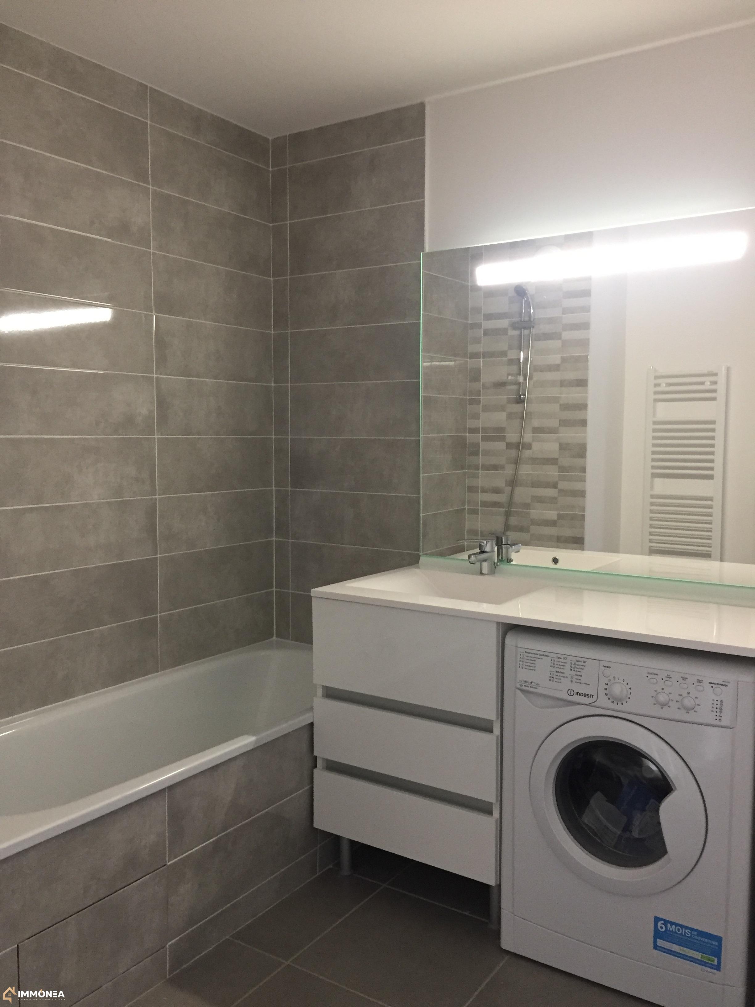 Salle de bain agrémentée de machine à laver, meuble sous vasque, miroir lumineux, baignoire et sèche serviette.