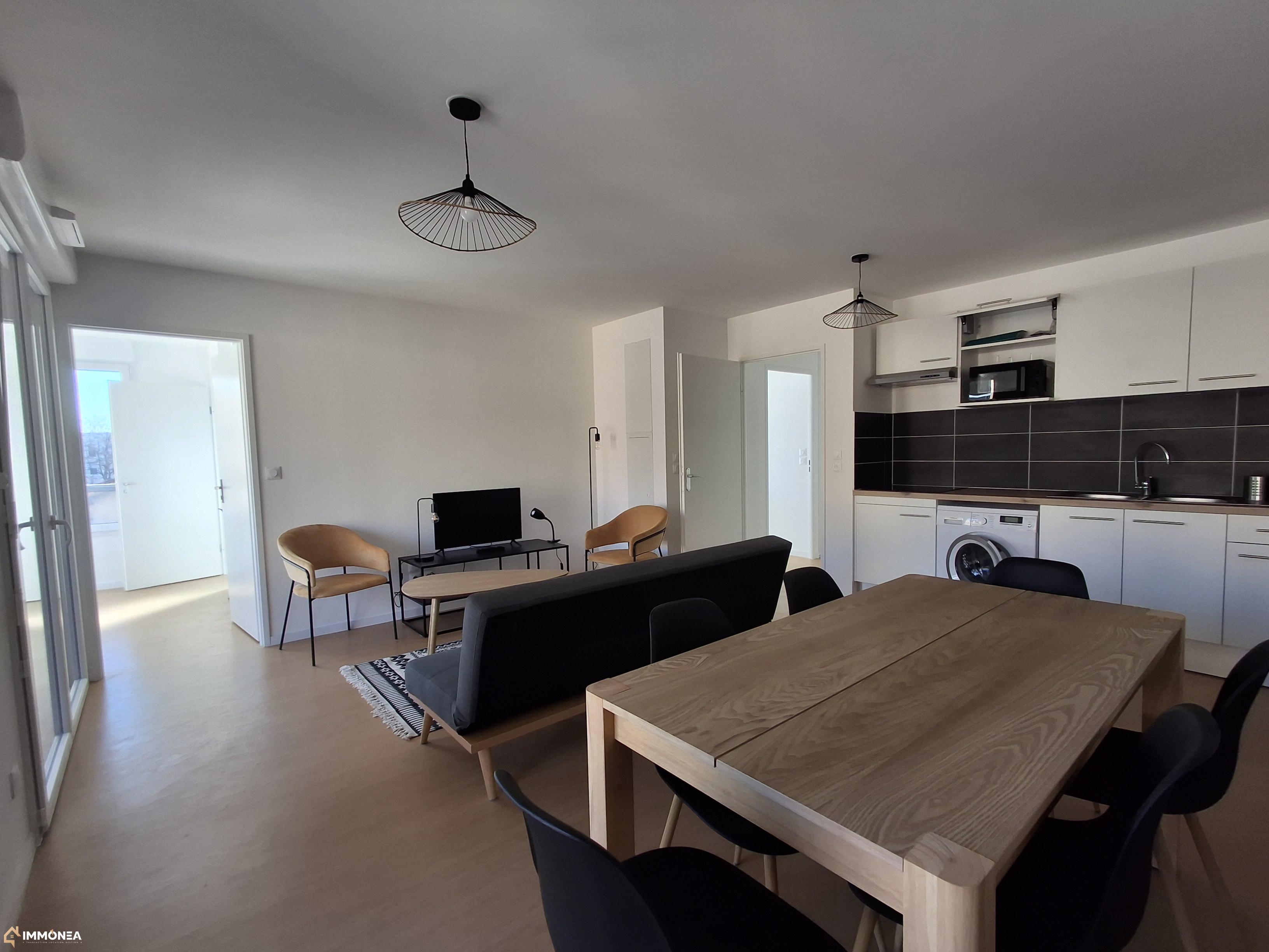 Il comprend : une entrée avec cellier de rangement, à l'étage ; une cuisine équipée et meublée (meubles hauts et bas, plaques de cuisson vitrocéramiques, hotte, frigo, emplacement pour un four encastrable) ouverte sur le séjour. La pièce de vie, lumineuse et facile à agencer donne sur une belle terrasse en bois de 6 m².
