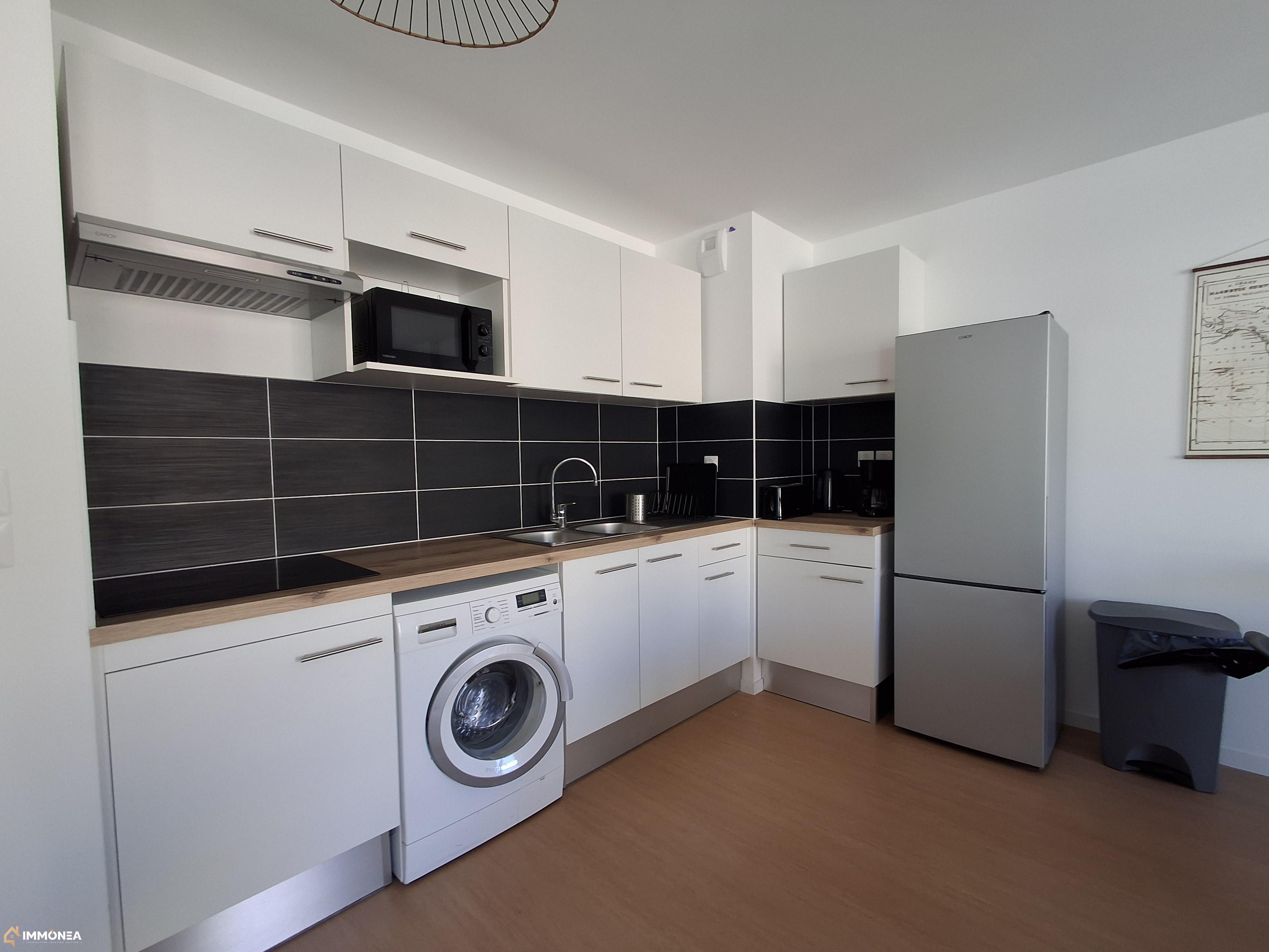 La cuisine est composée d'un ensemble de meubles hauts et bas et d'électroménager (réfrigérateur, plaque vitrocéramique, hotte aspirante), elle est ouverte sur un séjour donnant accès à une belle terrasse en bois sans vis à vis.