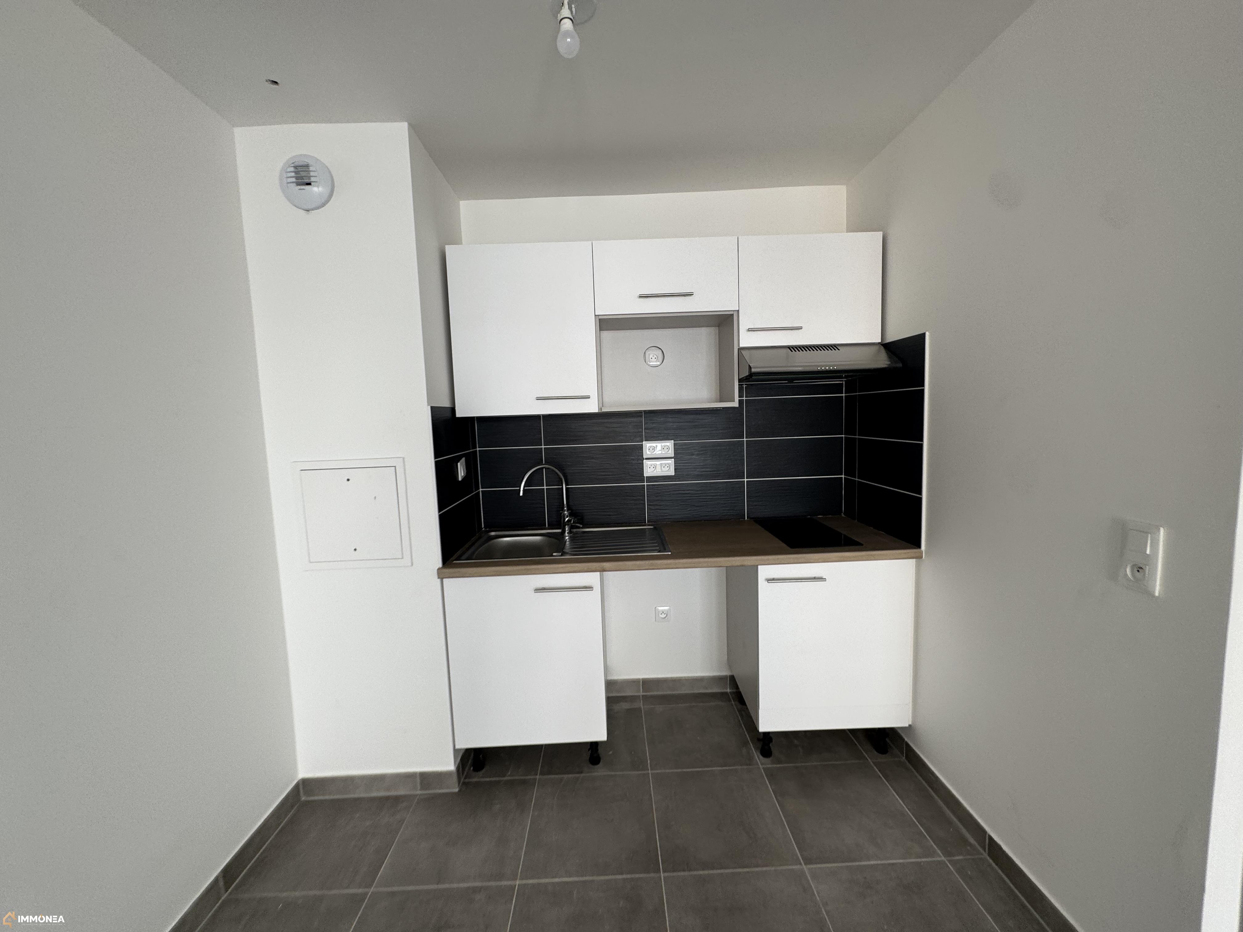 Il se compose d'une cuisine équipée de meubles hauts et bas, plaques vitrocéramique, hotte et réfrigérateur ouverte sur séjour.